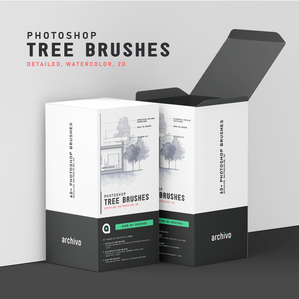 The product is a bundle of 60 Photoshop Tree Brushes designed for rendering your elevations, sections, and architectural illustrations.